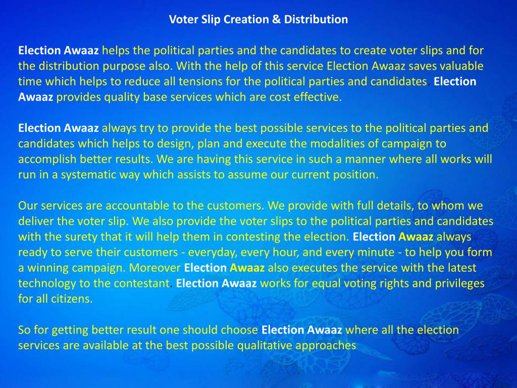 Voter Slip Creation & Distribution Election Awaaz helps the political parties and the candidates to create voter slips and for the distribution purpose also. With the help of this service Election Awaaz saves valuable time which helps to reduce all tensions for the political parties and candidates. Election Awaaz provides quality base services which are cost effective. Election Awaaz always try to provide the best possible services to the political parties and candidates which helps to design, plan and execute the modalities of campaign to accomplish better results. We are having this service in such a manner where all works will run in a systematic way which assists to assume our current position. Our services are accountable to the customers. We provide with full details, to whom we deliver the voter slip. We also provide the voter slips to the political parties and candidates with the surety that it will help them in contesting the election.Election Awaaz always ready to serve their customers - everyday, every hour, and every minute - to help you form a winning campaign. MoreoverElection Awaaz also executes the service with the latest technology to the contestant. Election Awaaz works for equal voting rights and privileges for all citizens. So for getting better result one should choose Election Awaaz where all the election services are available at the best possible qualitative approaches