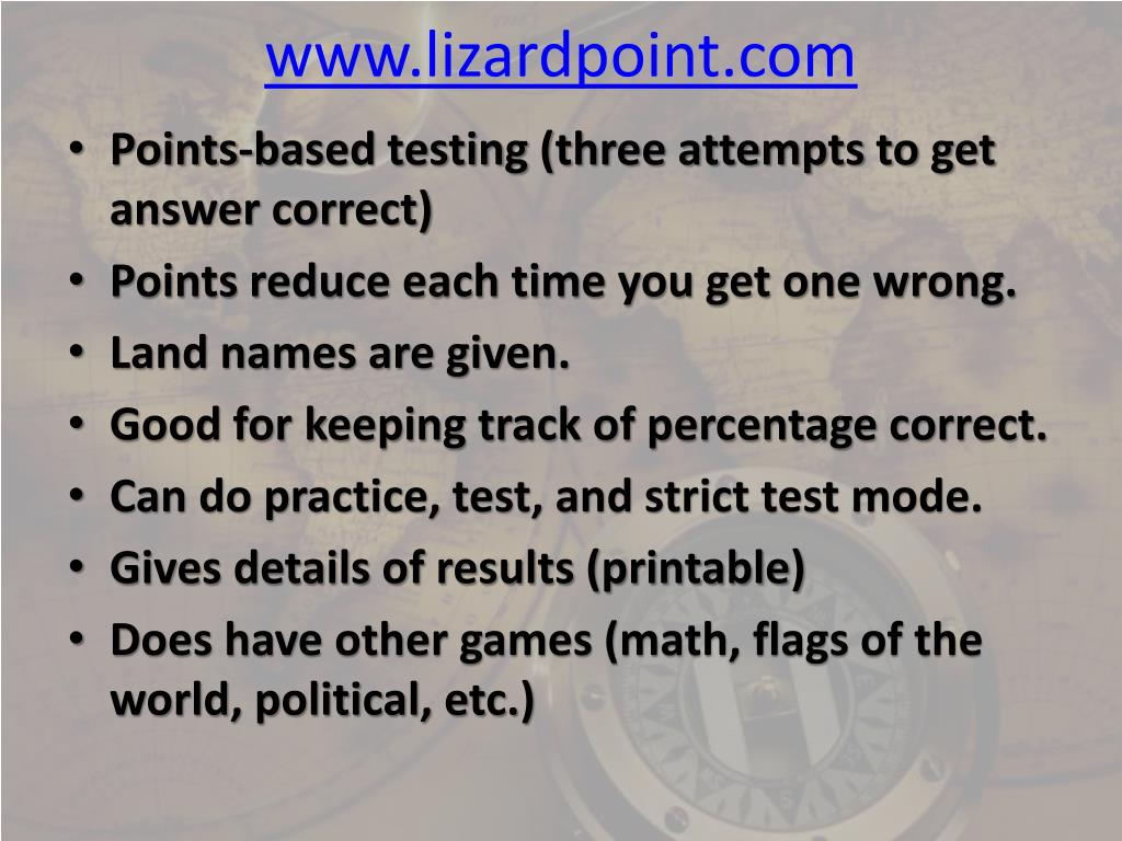 www.lizardpoint.com • Points-based testing (three attempts to get answer correct) • Points reduce each time you get one wrong. • Land names are given. • Good for keeping track of percentage correct. • Can do practice, test, and strict test mode. • Gives details of results (printable) • Does have other games (math, flags of the world, political, etc.)