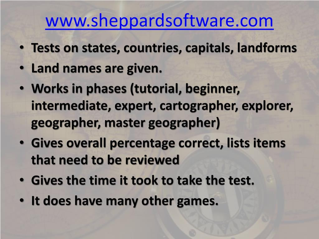 www.sheppardsoftware.com • Tests on states, countries, capitals, landforms • Land names are given. • Works in phases (tutorial, beginner, intermediate, expert, cartographer, explorer, geographer, master geographer) • Gives overall percentage correct, lists items that need to be reviewed • Gives the time it took to take the test. • It does have many other games.