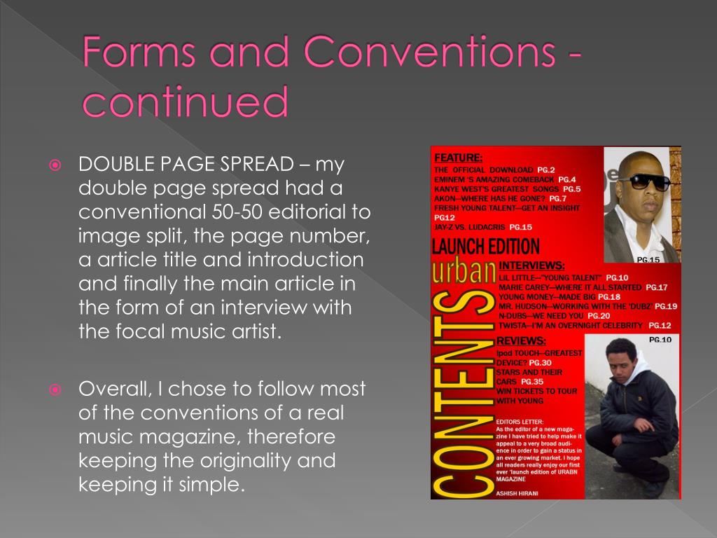 Forms and Conventions - continued • DOUBLE PAGE SPREAD – my double page spread had a conventional 50-50 editorial to image split, the page number, a article title and introduction and finally the main article in the form of an interview with the focal music artist. • Overall, I chose to follow most of the conventions of a real music magazine, therefore keeping the originality and keeping it simple.