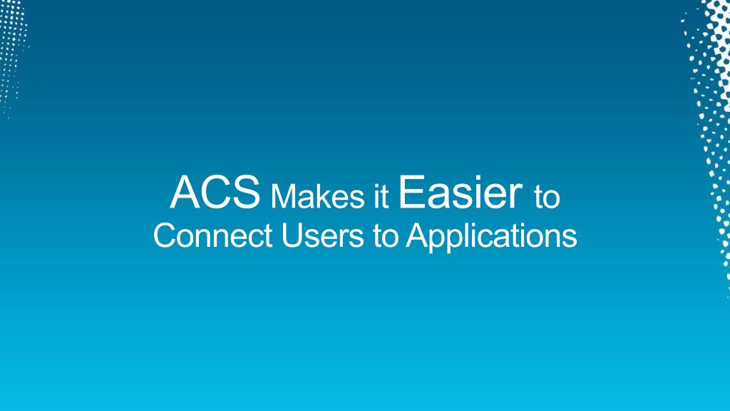 Using Windows Azure Access Control Service 2.0 with Your Cloud Application SIM324. Vittorio Bertocci Principal Technical Evangelist Microsoft. ACS Makes it Easier to Connect Users to Applications. Connecting Users to Applications. Windows Azure AppFabric Access Control Service.