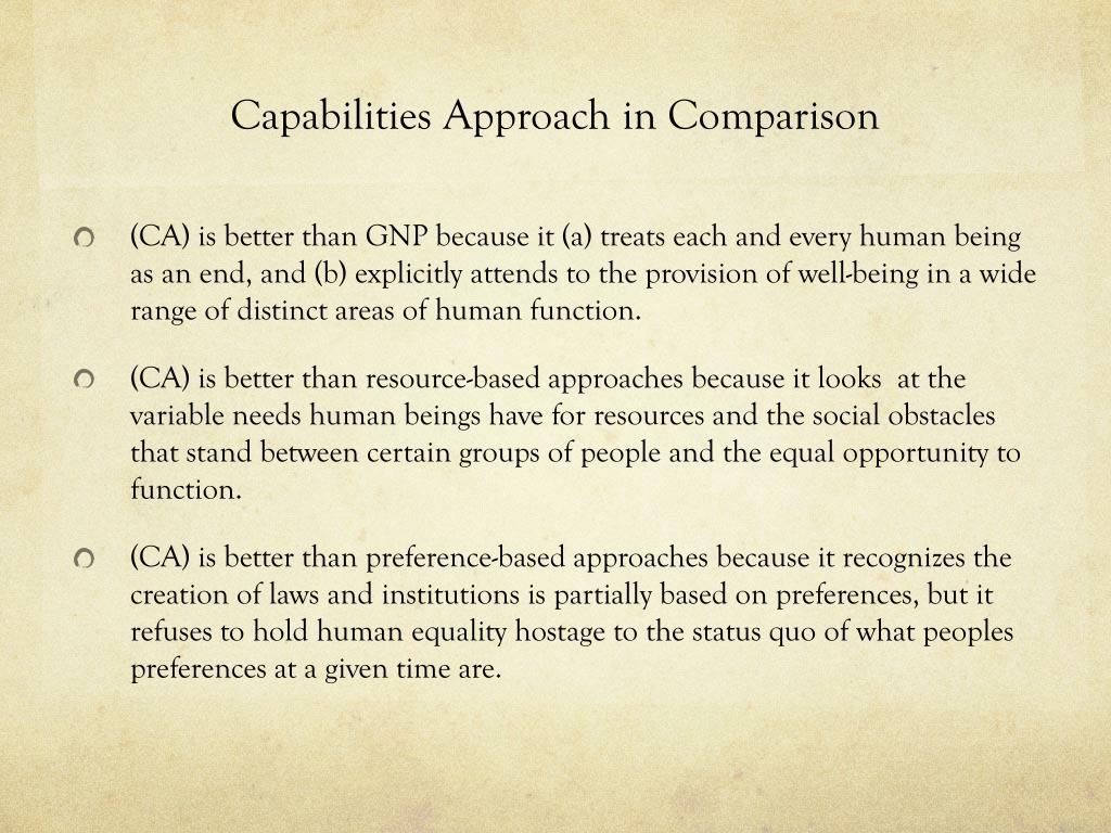 Capabilities Approach in Comparison • (CA) is better than GNP because it (a) treats each and every human being as an end, and (b) explicitly attends to the provision of well-being in a wide range of distinct areas of human function. • (CA) is better than resource-based approaches because it looks at the variable needs human beings have for resources and the social obstacles that stand between certain groups of people and the equal opportunity to function. • (CA) is better than preference-based approaches because it recognizes the creation of laws and institutions is partially based on preferences, but it refuses to hold human equality hostage to the status quo of what peoples preferences at a given time are.