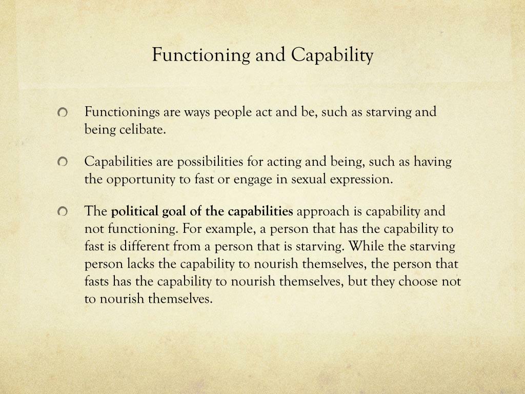 Functioning and Capability • Functionings are ways people act and be, such as starving and being celibate. • Capabilities are possibilities for acting and being, such as having the opportunity to fast or engage in sexual expression. • The political goal of the capabilities approach is capability and not functioning. For example, a person that has the capability to fast is different from a person that is starving. While the starving person lacks the capability to nourish themselves, the person that fasts has the capability to nourish themselves, but they choose not to nourish themselves.