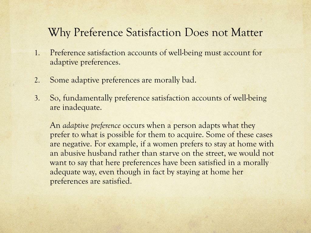 Why Preference Satisfaction Does not Matter • Preference satisfaction accounts of well-being must account for adaptive preferences. • Some adaptive preferences are morally bad. • So, fundamentally preference satisfaction accounts of well-being are inadequate. An adaptive preference occurs when a person adapts what they prefer to what is possible for them to acquire. Some of these cases are negative. For example, if a women prefers to stay at home with an abusive husband rather than starve on the street, we would not want to say that here preferences have been satisfied in a morally adequate way, even though in fact by staying at home her preferences are satisfied.