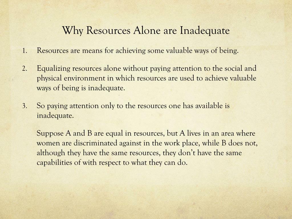 Why Resources Alone are Inadequate • Resources are means for achieving some valuable ways of being. • Equalizing resources alone without paying attention to the social and physical environment in which resources are used to achieve valuable ways of being is inadequate. • So paying attention only to the resources one has available is inadequate. Suppose A and B are equal in resources, but A lives in an area where women are discriminated against in the work place, while B does not, although they have the same resources, they don’t have the same capabilities of with respect to what they can do.