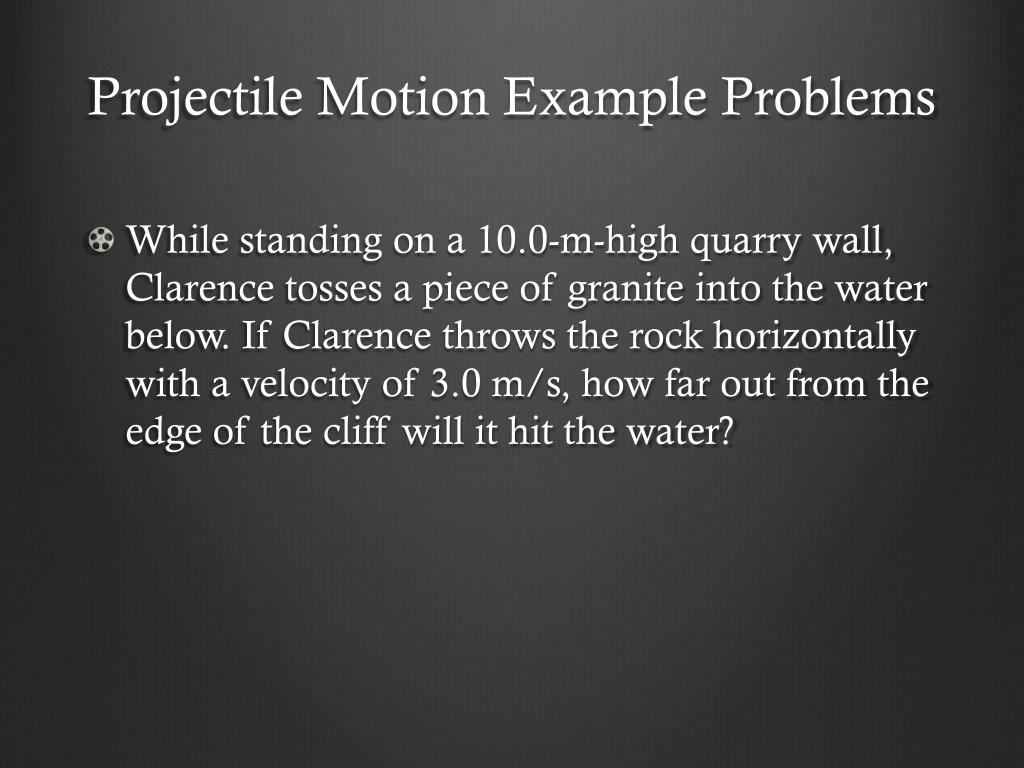 Projectile Motion Example Problems • While standing on a 10.0-m-high quarry wall, Clarence tosses a piece of granite into the water below. If Clarence throws the rock horizontally with a velocity of 3.0 m/s, how far out from the edge of the cliff will it hit the water?