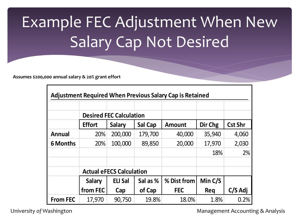 eFECS Application of New Salary Cap In those cases adjustments will need to be made to the salary cap cost sharing amounts calculated by eFECS. Detailed guidance for making adjustments to the salary cap cost sharing amounts on the FEC will be provided closer to the time the FEC reports are to be released. University ofWashington Management Accounting & Analysis