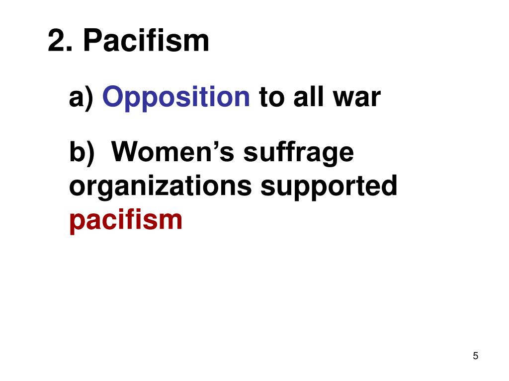 2. Pacifism a) Opposition to all war b) Women’s suffrage organizations supported pacifism