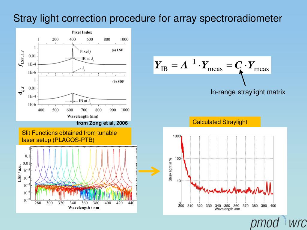 Stray light correction procedure for array spectroradiometer In-range straylight matrix Calculated Straylight from Zong et al, 2006 Slit Functions obtained from tunable laser setup (PLACOS-PTB)