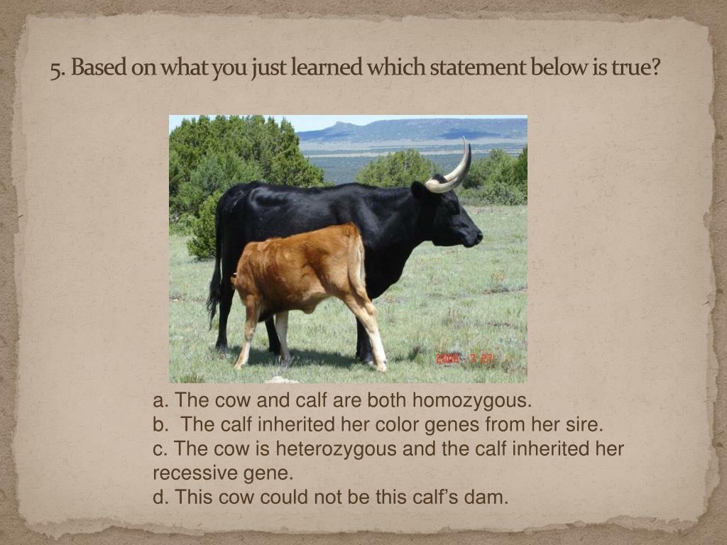 5. Based on what you just learned which statement below is true? a. The cow and calf are both homozygous. b. The calf inherited her color genes from her sire. c. The cow is heterozygous and the calf inherited her recessive gene. d. This cow could not be this calf’s dam.