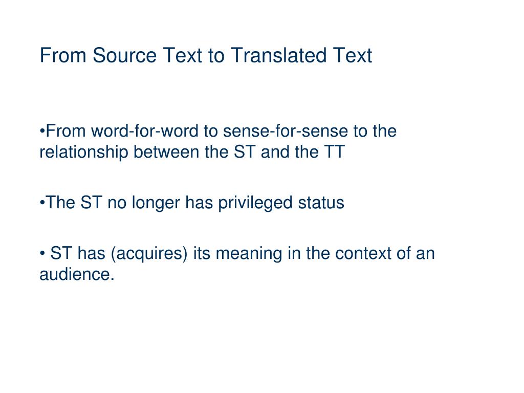 From Source Text to Translated Text From word-for-word to sense-for-sense to the relationship between the ST and the TT The ST no longer has privileged status ST has (acquires) its meaning in the context of an audience.