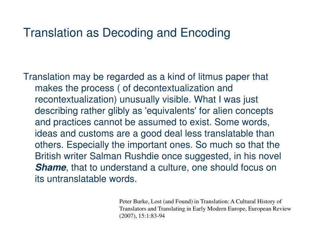 Translation as Decoding and Encoding Translation may be regarded as a kind of litmus paper that makes the process ( of decontextualization and recontextualization) unusually visible. What I was just describing rather glibly as 'equivalents' for alien concepts and practices cannot be assumed to exist. Some words, ideas and customs are a good deal less translatable than others. Especially the important ones. So much so that the British writer Salman Rushdie once suggested, in his novel Shame, that to understand a culture, one should focus on its untranslatable words. Peter Burke, Lost (and Found) in Translation: A Cultural History of Translators and Translating in Early Modern Europe, European Review (2007), 15:1:83-94