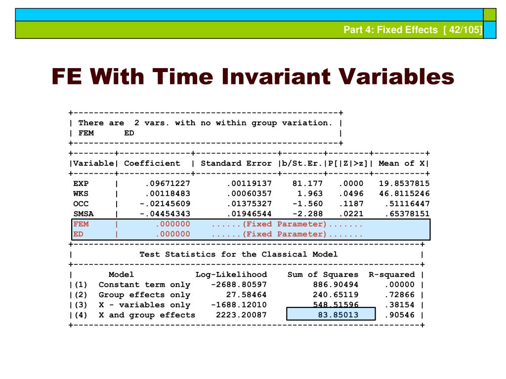 FE With Time Invariant Variables +----------------------------------------------------+ | There are 2 vars. with no within group variation. | | FEM ED | +----------------------------------------------------+ +--------+--------------+----------------+--------+--------+----------+ |Variable| Coefficient | Standard Error |b/St.Er.|P[|Z|>z]| Mean of X| +--------+--------------+----------------+--------+--------+----------+ EXP | .09671227 .00119137 81.177 .0000 19.8537815 WKS | .00118483 .00060357 1.963 .0496 46.8115246 OCC | -.02145609 .01375327 -1.560 .1187 .51116447 SMSA | -.04454343 .01946544 -2.288 .0221 .65378151 FEM | .000000 ......(Fixed Parameter)....... ED | .000000 ......(Fixed Parameter)....... +--------------------------------------------------------------------+ | Test Statistics for the Classical Model | +--------------------------------------------------------------------+ | Model Log-Likelihood Sum of Squares R-squared | |(1) Constant term only -2688.80597 886.90494 .00000 | |(2) Group effects only 27.58464 240.65119 .72866 | |(3) X - variables only -1688.12010 548.51596 .38154 | |(4) X and group effects 2223.20087 83.85013 .90546 | +--------------------------------------------------------------------+