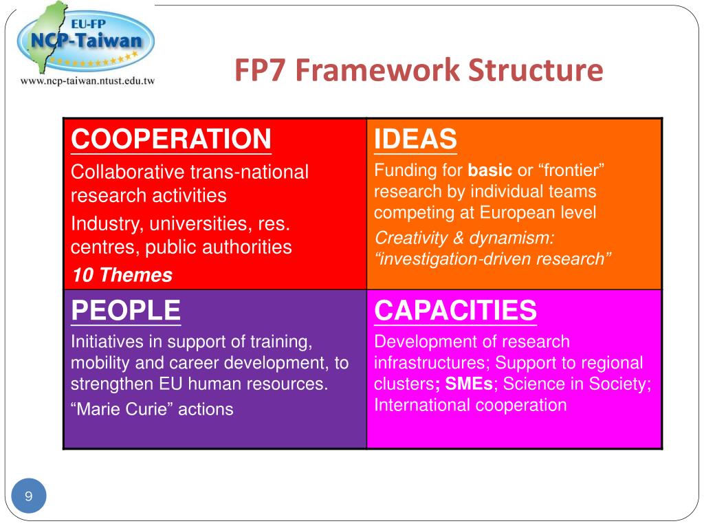 FP7簡介 • FP計畫(Framework Programme)始自1984年。2007至2013年為FP計畫第七期,即FP7。 • FP7擬投入預算高達532億歐元,約為2兆4000億台幣。 • FP計畫希望強化歐盟的創新研發能力,提供會員國旗下產官學界研發經費及平台服務。 • FP7的短期目標為傳承FP6,建立「歐洲研究區域」;長程目標則欲發展歐洲成為以知識為本的經濟與社會體。 • 補助歐盟會員國及發展中國家(ICPC)研究經費(原則不補助台灣研究經費) 2