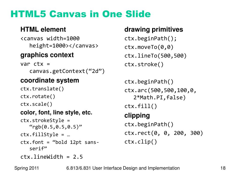 HTML5 Canvas in One Slide HTML element <canvas width=1000 height=1000></canvas> graphics context var ctx = canvas.getContext(“2d”) coordinate system ctx.translate() ctx.rotate() ctx.scale() color, font, line style, etc. ctx.strokeStyle = “rgb(0.5,0.5,0.5)” ctx.fillStyle = … ctx.font = “bold 12pt sans-serif” ctx.lineWidth = 2.5 drawing primitives ctx.beginPath(); ctx.moveTo(0,0) ctx.lineTo(500,500) ctx.stroke() ctx.beginPath() ctx.arc(500,500,100,0, 2*Math.PI,false) ctx.fill() clipping ctx.beginPath() ctx.rect(0, 0, 200, 300) ctx.clip() 6.813/6.831 User Interface Design and Implementation