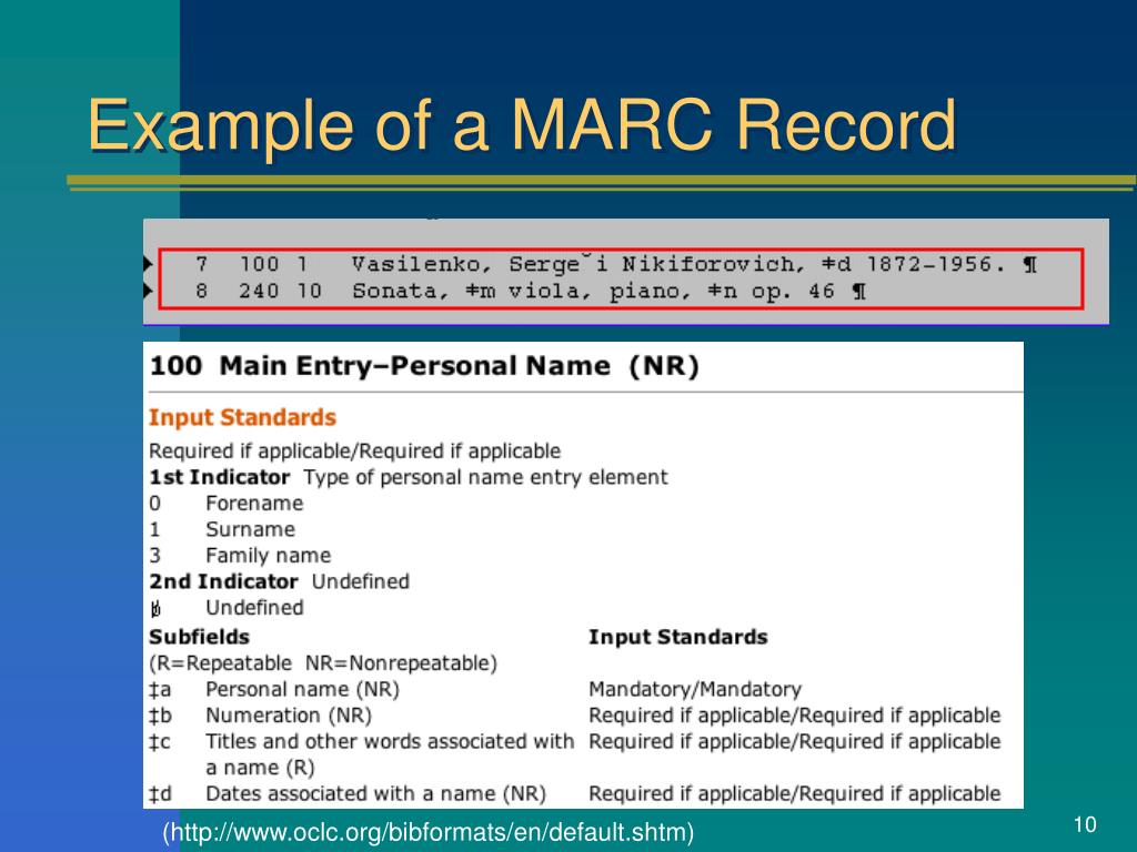 Example of a MARC Record Fixed fields --> (Leader) -------------- computer generated index (Directory) -------------- Variable fields --> • Tag (3-digit number) • Indicator (1-digit number) • Subfield (preceded by the delimiter e.g. ‡n) (http://www.music.indiana.edu/tech_s/manuals/training/marc/record1.html)