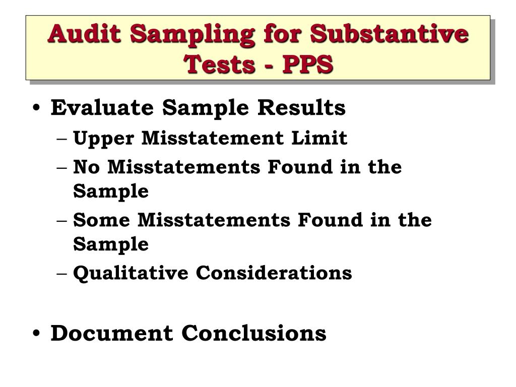 Audit Sampling for Substantive Tests - PPS • Evaluate Sample Results • Upper Misstatement Limit • No Misstatements Found in the Sample • Some Misstatements Found in the Sample • Qualitative Considerations • Document Conclusions