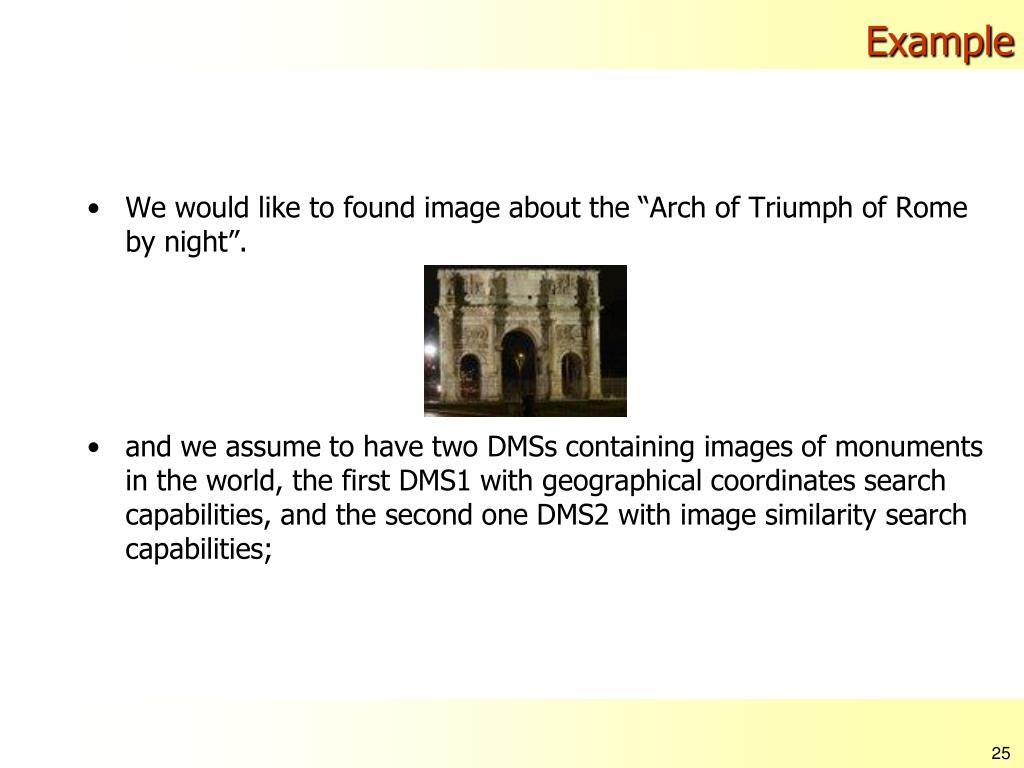 Example • We would like to found image about the “Arch of Triumph of Rome by night”. • and we assume to have two DMSs containing images of monuments in the world, the first DMS1 with geographical coordinates search capabilities, and the second one DMS2 with image similarity search capabilities;