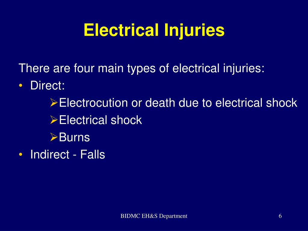 Electrical Injuries There are four main types of electrical injuries: • Direct: • Electrocution or death due to electrical shock • Electrical shock • Burns • Indirect - Falls BIDMC EH&S Department