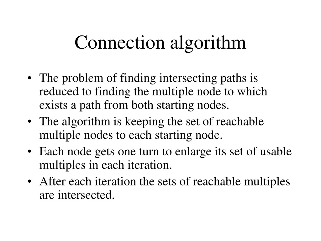 Connection algorithm • The problem of finding intersecting paths is reduced to finding the multiple node to which exists a path from both starting nodes. • The algorithm is keeping the set of reachable multiple nodes to each starting node. • Each node gets one turn to enlarge its set of usable multiples in each iteration. • After each iteration the sets of reachable multiples are intersected.