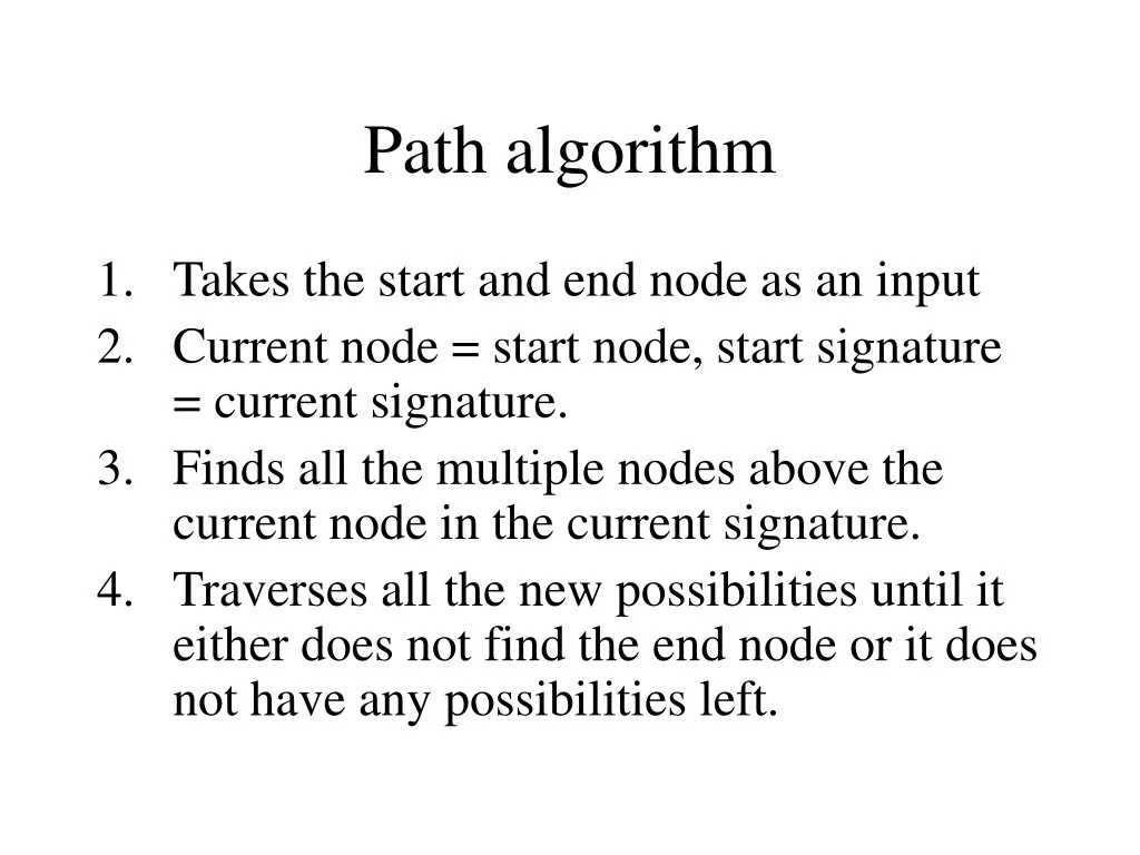 Path algorithm • Takes the start and end node as an input • Current node = start node, start signature = current signature. • Finds all the multiple nodes above the current node in the current signature. • Traverses all the new possibilities until it either does not find the end node or it does not have any possibilities left.