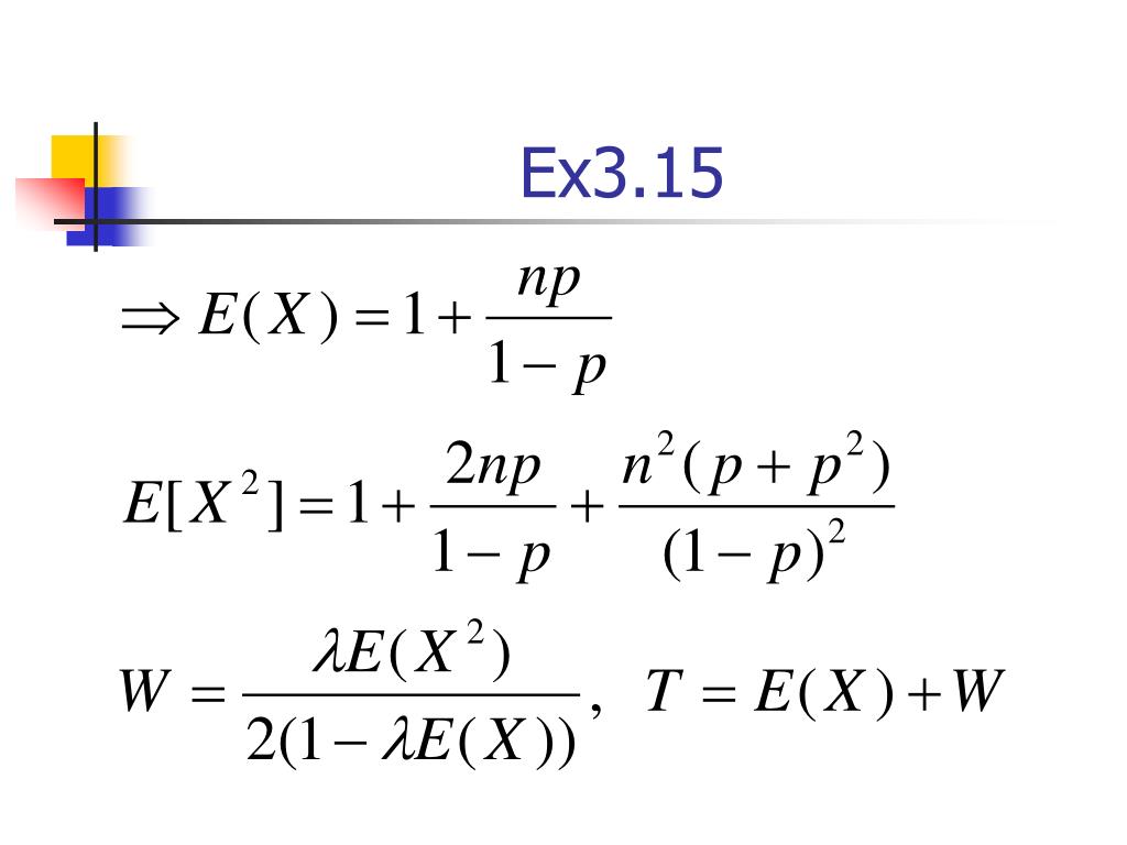 Ex3.15 Service time X : from when a packet transmitted until it is successfully received 1 , if 1st tx is successful (1-p) X={ 1+n, if 1st tx is un- successful; 2nd is successful p(1-p) 1+kn, if 1st k is un- successful;(k+1)th successful Pk(1-p)