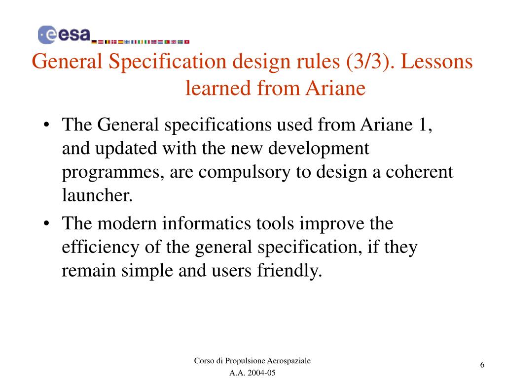 General Specification design rules (3/3). Lessons learned from Ariane • The General specifications used from Ariane 1, and updated with the new development programmes, are compulsory to design a coherent launcher. • The modern informatics tools improve the efficiency of the general specification, if they remain simple and users friendly.