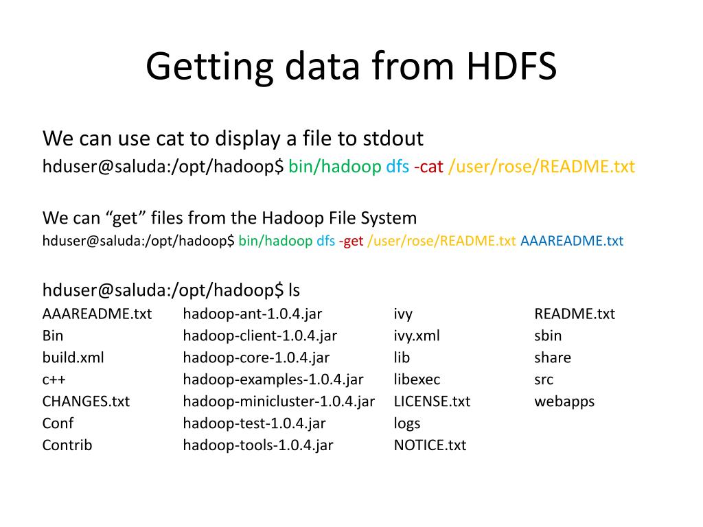 Getting data from HDFS We can use cat to display a file to stdout hduser@saluda:/opt/hadoop$ bin/hadoopdfs-cat /user/rose/README.txt We can “get” files from the Hadoop File System hduser@saluda:/opt/hadoop$ bin/hadoopdfs-get /user/rose/README.txt AAAREADME.txt hduser@saluda:/opt/hadoop$ ls AAAREADME.txt hadoop-ant-1.0.4.jar ivy README.txt Bin hadoop-client-1.0.4.jar ivy.xml sbin build.xml hadoop-core-1.0.4.jar lib share c++ hadoop-examples-1.0.4.jar libexecsrc CHANGES.txt hadoop-minicluster-1.0.4.jar LICENSE.txt webapps Conf hadoop-test-1.0.4.jar logs Contrib hadoop-tools-1.0.4.jar NOTICE.txt