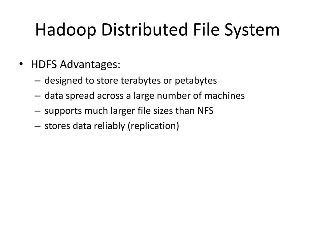 Hadoop Distributed File System • HDFS Advantages: • designed to store terabytes or petabytes • data spread across a large number of machines • supports much larger file sizes than NFS • stores data reliably (replication)