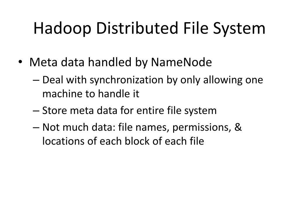 Hadoop Distributed File System • Meta data handled by NameNode • Deal with synchronization by only allowing one machine to handle it • Store meta data for entire file system • Not much data: file names, permissions, & locations of each block of each file
