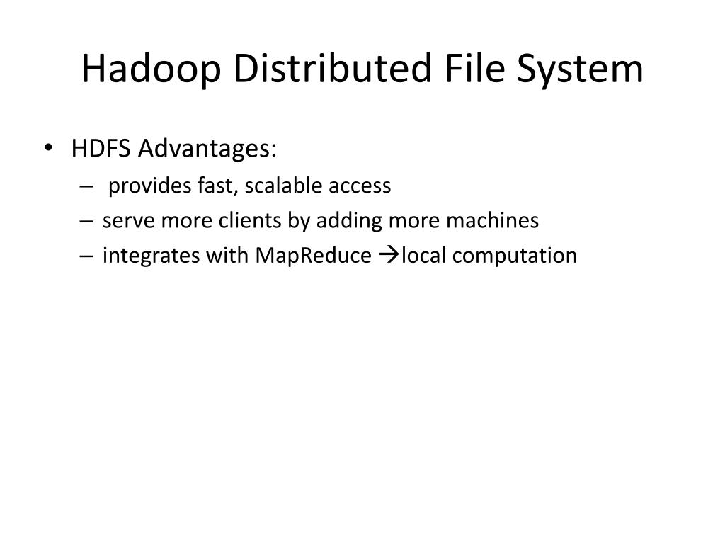 Hadoop Distributed File System • HDFS Advantages: • provides fast, scalable access • serve more clients by adding more machines • integrates with MapReducelocal computation