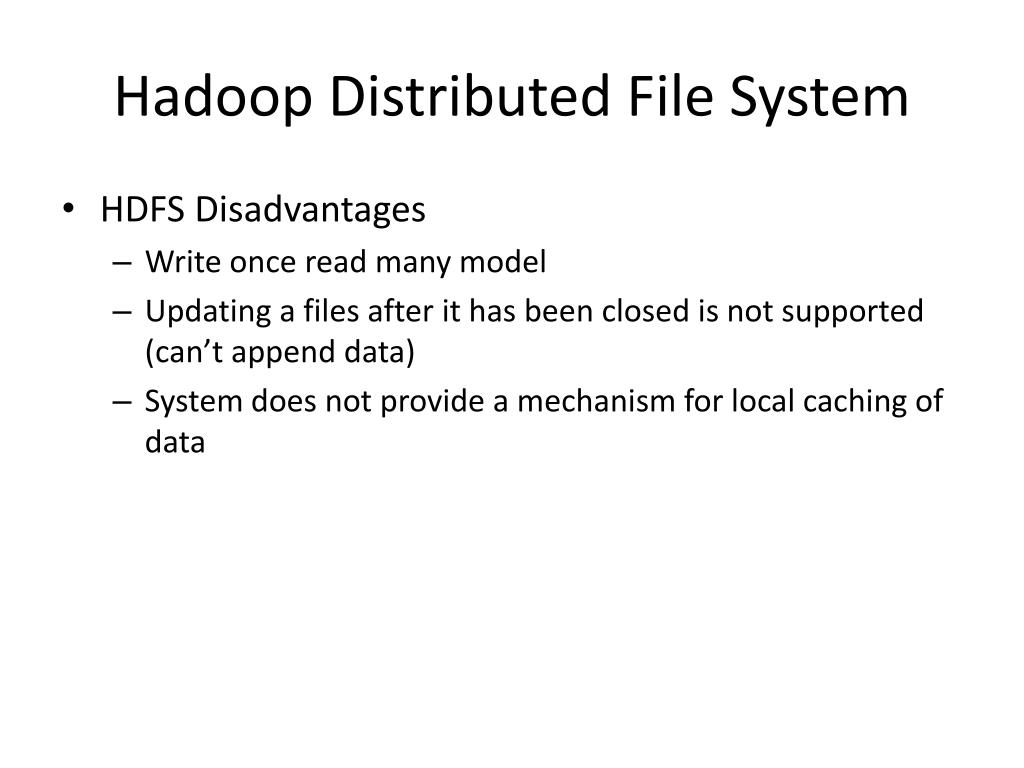 Hadoop Distributed File System • HDFS Disadvantages • Write once read many model • Updating a files after it has been closed is not supported (can’t append data) • System does not provide a mechanism for local caching of data