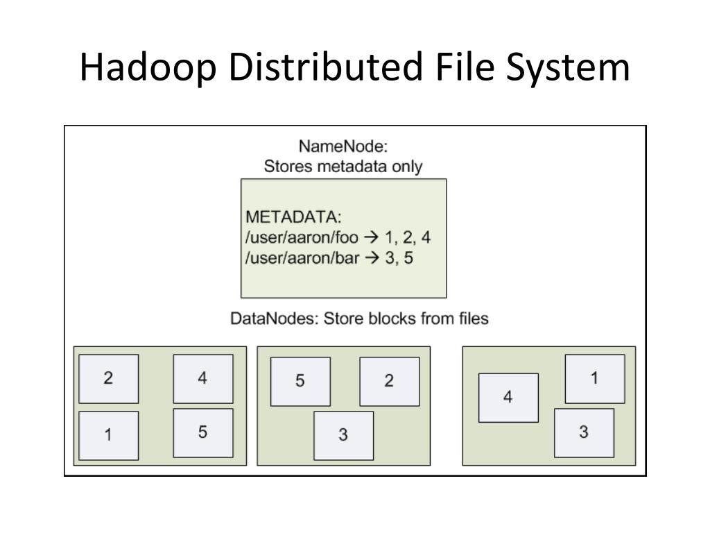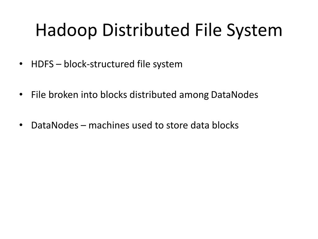 Hadoop Distributed File System • HDFS – block-structured file system • File broken into blocks distributed among DataNodes • DataNodes – machines used to store data blocks