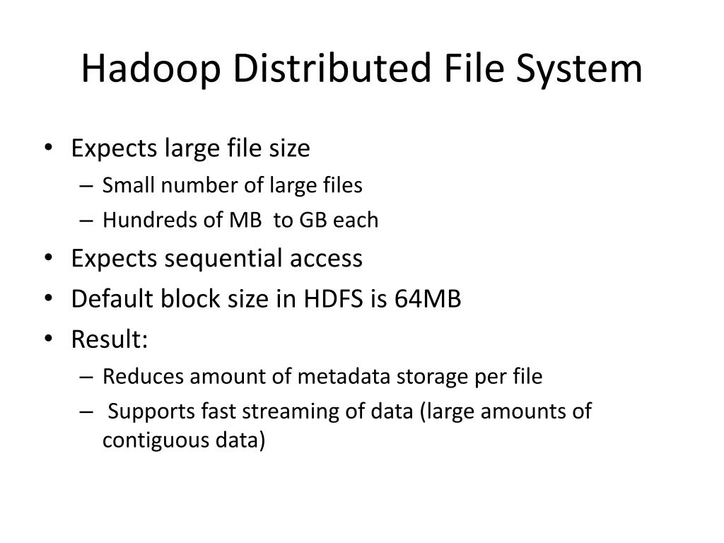 Hadoop Distributed File System • Expects large file size • Small number of large files • Hundreds of MB to GB each • Expects sequential access • Default block size in HDFS is 64MB • Result: • Reduces amount of metadata storage per file • Supports fast streaming of data (large amounts of contiguous data)