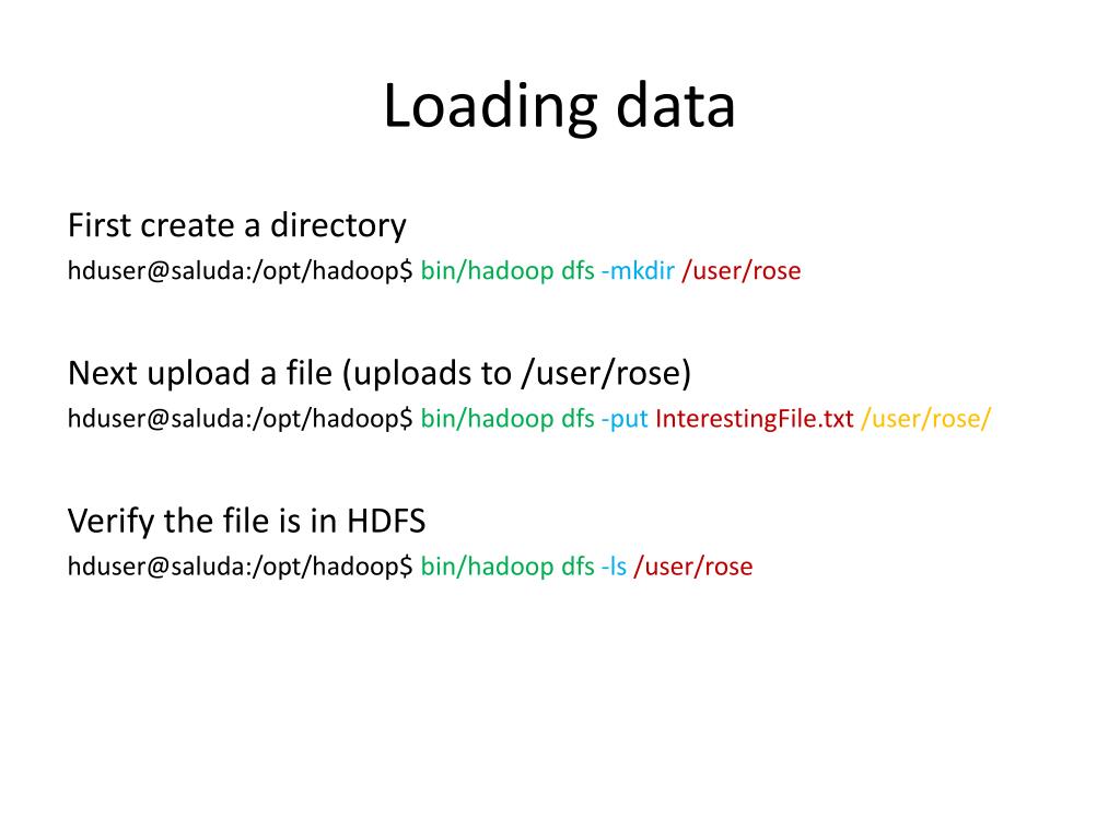 Loading data First create a directory hduser@saluda:/opt/hadoop$ bin/hadoopdfs-mkdir/user/rose Next upload a file (uploads to /user/rose) hduser@saluda:/opt/hadoop$ bin/hadoopdfs-put InterestingFile.txt /user/rose/ Verify the file is in HDFS hduser@saluda:/opt/hadoop$ bin/hadoopdfs-ls/user/rose