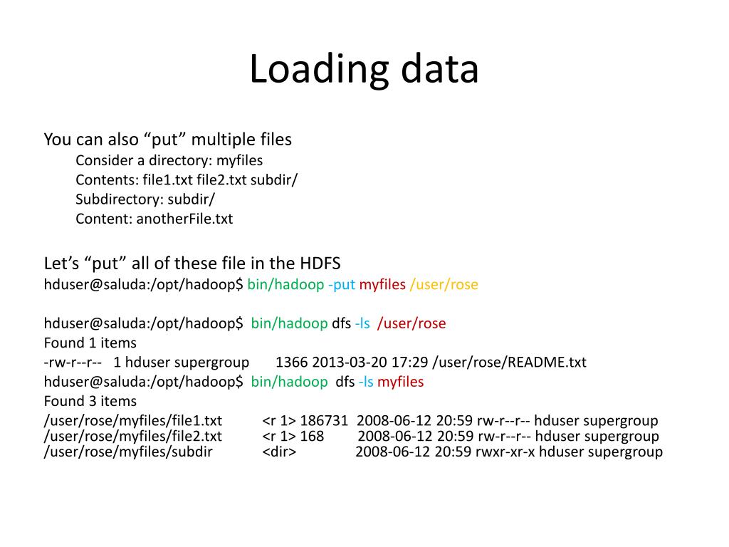 Loading data You can also “put” multiple files Consider a directory: myfiles Contents: file1.txt file2.txt subdir/ Subdirectory: subdir/ Content: anotherFile.txt Let’s “put” all of these file in the HDFS hduser@saluda:/opt/hadoop$bin/hadoop-putmyfiles/user/rose hduser@saluda:/opt/hadoop$ bin/hadoopdfs-ls/user/rose Found 1 items -rw-r--r-- 1 hdusersupergroup 1366 2013-03-20 17:29 /user/rose/README.txt hduser@saluda:/opt/hadoop$ bin/hadoopdfs-lsmyfiles Found 3 items /user/rose/myfiles/file1.txt <r 1> 186731 2008-06-12 20:59 rw-r--r-- hdusersupergroup /user/rose/myfiles/file2.txt <r 1> 168 2008-06-12 20:59 rw-r--r-- hdusersupergroup /user/rose/myfiles/subdir <dir> 2008-06-12 20:59 rwxr-xr-x hdusersupergroup
