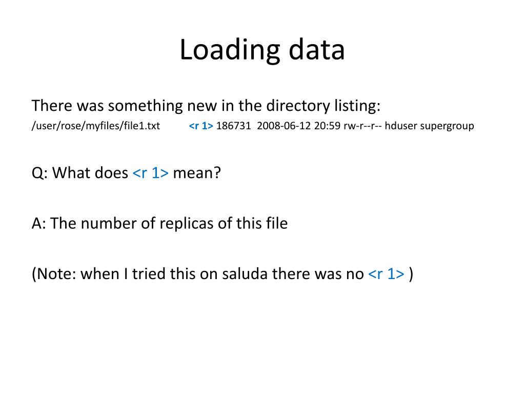 Loading data There was something new in the directory listing: /user/rose/myfiles/file1.txt <r 1> 186731 2008-06-12 20:59 rw-r--r-- hdusersupergroup Q: What does <r 1> mean? A: The number of replicas of this file (Note: when I tried this on saluda there was no <r 1> )