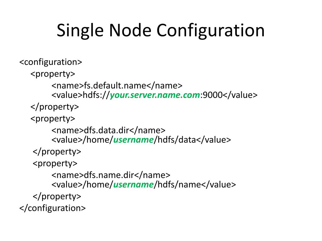 Single Node Configuration <configuration> <property> <name>fs.default.name</name> <value>hdfs://your.server.name.com:9000</value> </property> <property> <name>dfs.data.dir</name> <value>/home/username/hdfs/data</value> </property> <property> <name>dfs.name.dir</name> <value>/home/username/hdfs/name</value> </property> </configuration>