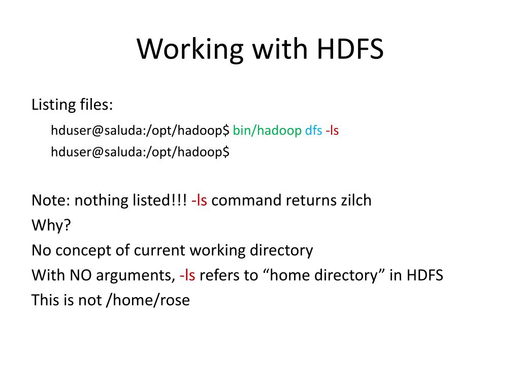 Working with HDFS Listing files: hduser@saluda:/opt/hadoop$ bin/hadoopdfs-ls hduser@saluda:/opt/hadoop$ Note: nothing listed!!! -lscommand returns zilch Why? No concept of current working directory With NO arguments, -lsrefers to “home directory” in HDFS This is not /home/rose