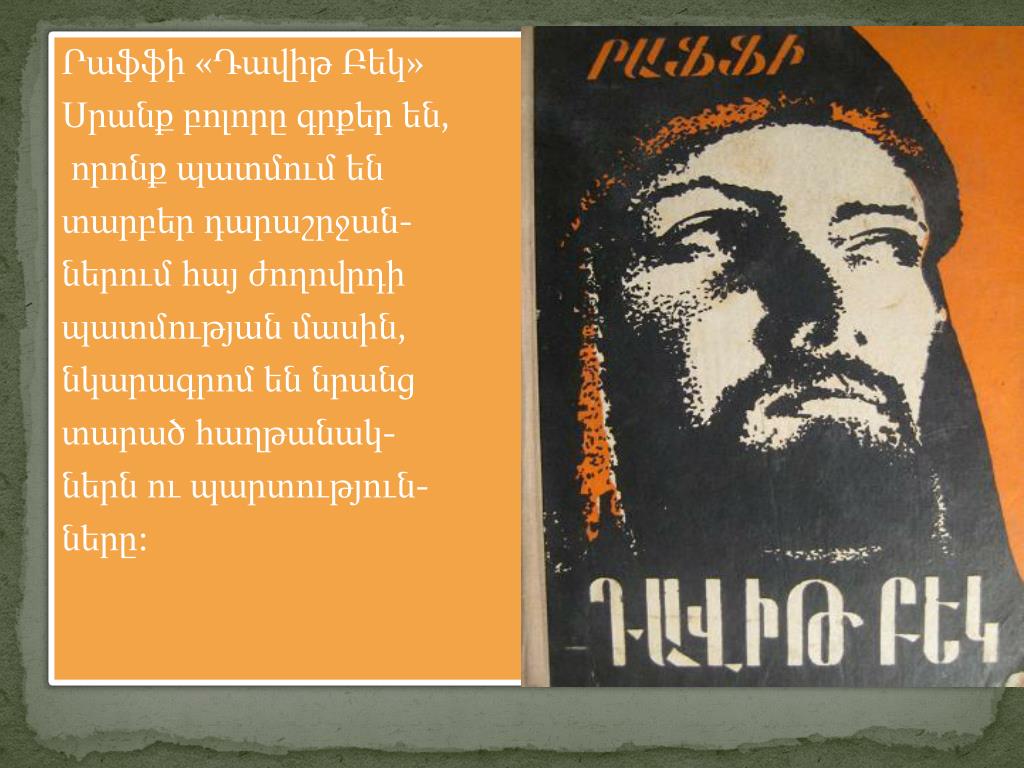 Րաֆֆի «Դավիթ Բեկ» Սրանքբոլորըգրքերեն, որոնքպատմումեն տարբերդարաշրջան- ներումհայժողովրդի պատմությանմասին, նկարագրոմեննրանց տարածհաղթանակ- ներնուպարտություն- ները: