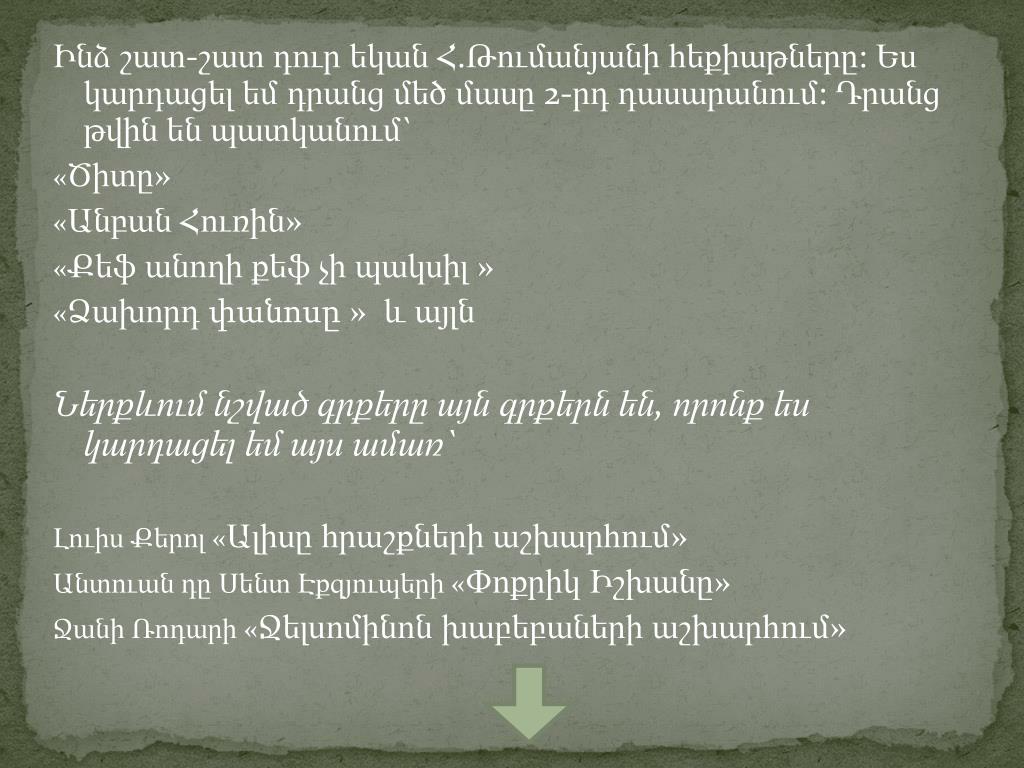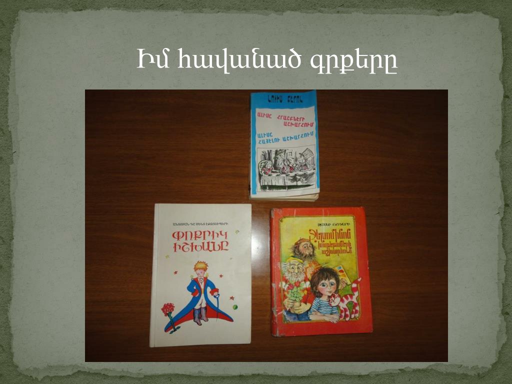 Ինձշատ-շատդուրեկանՀ.Թումանյանիհեքիաթները: Եսկարդացելեմդրանցմեծմասը 2-րդ դասարանում: Դրանցթվինենպատկանում` «Ծիտը» «Անբան Հուռին» «Քեֆ անողի քեֆ չի պակսիլ » «Ձախորդ փանոսը » և այլն Ներքևում նշված գրքերը այն գրքերն են, որոնք ես կարդացել եմ այս ամառ` Լուիս Քերոլ «Ալիսը հրաշքների աշխարհում» Անտուան դը Սենտ Էքզյուպերի «Փոքրիկ Իշխանը» Ջանի Ռոդարի «Ջելսոմինոն խաբեբաների աշխարհում»