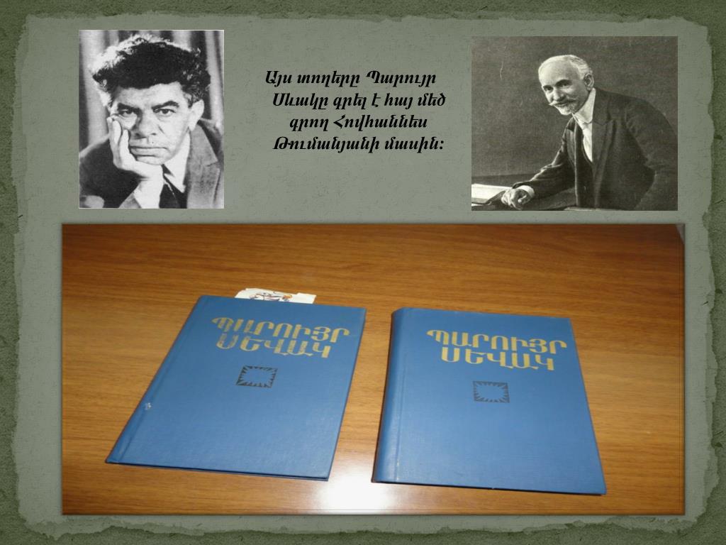 « Մխիթար Սեբաստացի » Կ րթահամալիր Ընտանիքիս և իմ հավանած գրքերը Դպրոց-պարտեզ 4-1 դասարան Բորիս Բաղդասարյան. Ի մ հայրիկի սիրած բանաստեղծը Պարույր Սևակն է : Հազար ութ հարյուր վաթսունիննը թվին Հայոց այգիներն ի ՞ նչ պտուղ տվին.