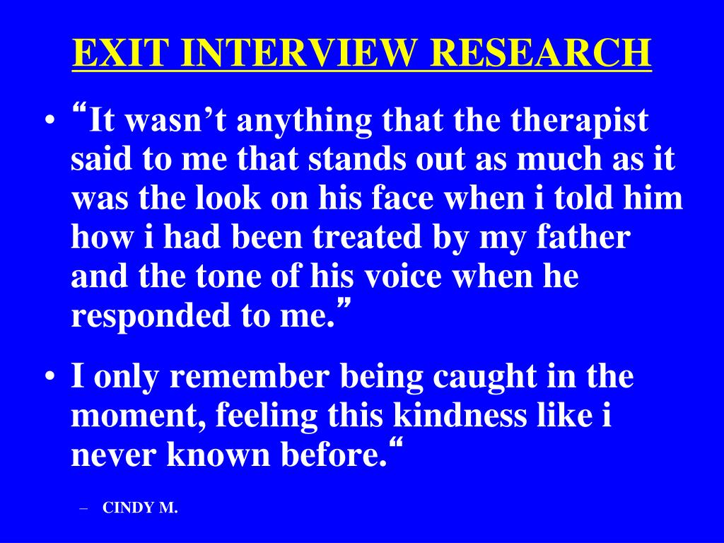 EXIT INTERVIEW RESEARCH • “It wasn’t anything that the therapist said to me that stands out as much as it was the look on his face when i told him how i had been treated by my father and the tone of his voice when he responded to me.” • I only remember being caught in the moment, feeling this kindness like i never known before.“ • CINDY M.