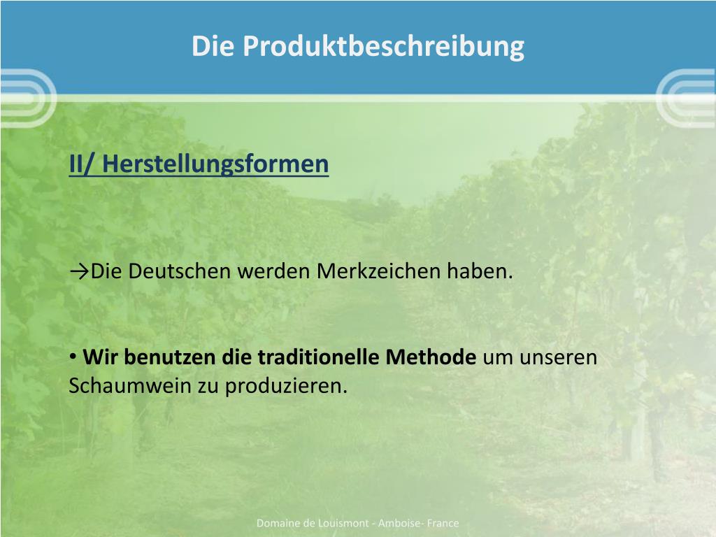 Die Produktbeschreibung • II/ Herstellungsformen • →Die Deutschen werden Merkzeichen haben. • Wir benutzen die traditionelle Methode um unseren Schaumwein zu produzieren. Domaine de Louismont - Amboise- France