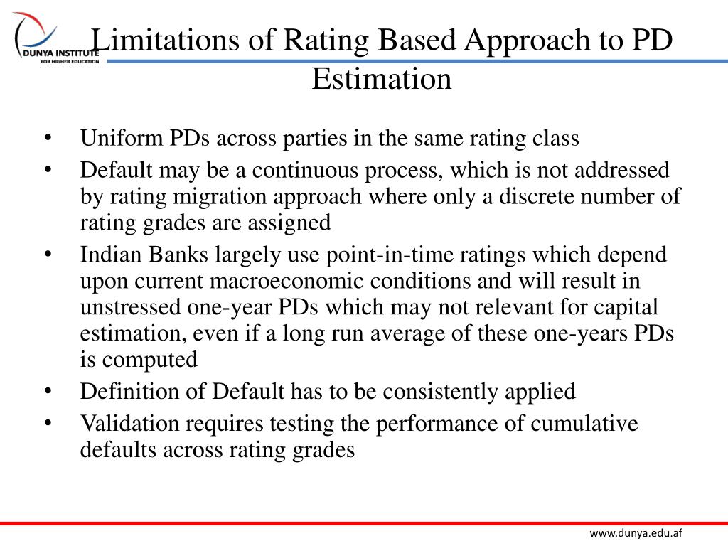 Limitations of Rating Based Approach to PD Estimation • Uniform PDs across parties in the same rating class • Default may be a continuous process, which is not addressed by rating migration approach where only a discrete number of rating grades are assigned • Indian Banks largely use point-in-time ratings which depend upon current macroeconomic conditions and will result in unstressed one-year PDs which may not relevant for capital estimation, even if a long run average of these one-years PDs is computed • Definition of Default has to be consistently applied • Validation requires testing the performance of cumulative defaults across rating grades