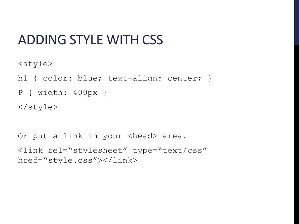 Adding Style with CSS • <style> • h1 { color: blue; text-align: center; } • P { width: 400px } • </style> • Or put a link in your <head> area. • <link rel=“stylesheet” type=“text/css” href=“style.css”></link>