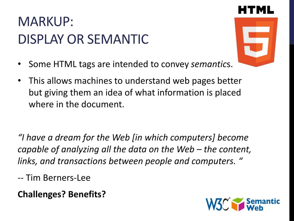 Markup:Display or Semantic • Some HTML tags are intended to convey semantics. • This allows machines to understand web pages better but giving them an idea of what information is placed where in the document. • “I have a dream for the Web [in which computers] become capable of analyzing all the data on the Web – the content, links, and transactions between people and computers. “ • -- Tim Berners-Lee • Challenges? Benefits?