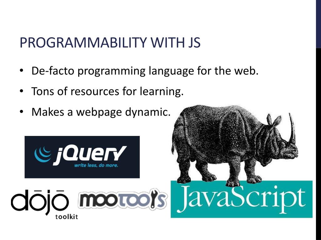 Programmability with JS • De-facto programming language for the web. • Tons of resources for learning. • Makes a webpage dynamic.