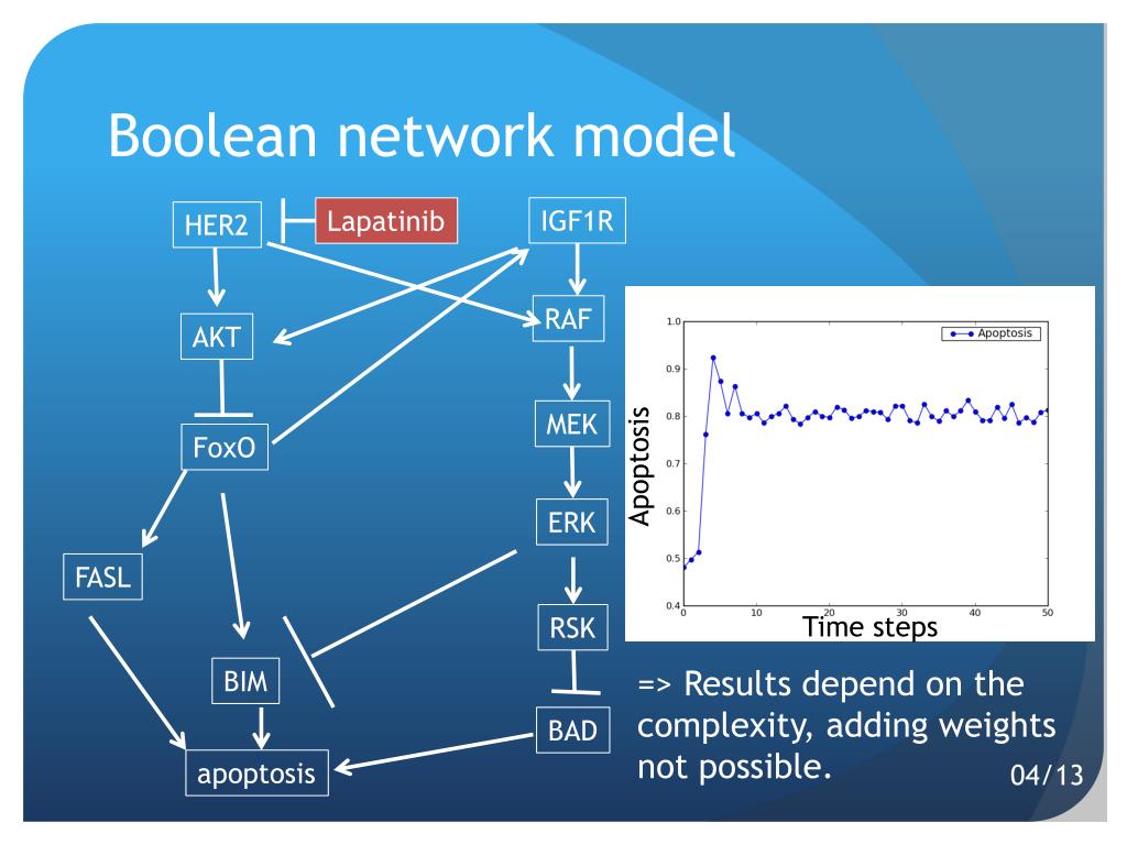 Boolean network model IGF1R Lapatinib HER2 RAF AKT MEK FoxO Apoptosis ERK FASL Time steps RSK => Results depend on the complexity, adding weights not possible. BIM BAD apoptosis 04/13