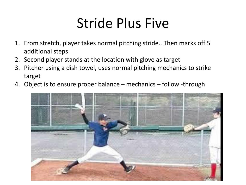 Stride Plus Five From stretch, player takes normal pitching stride.. Then marks off 5 additional steps Second player stands at the location with glove as target Pitcher using a dish towel, uses normal pitching mechanics to strike target Object is to ensure proper balance – mechanics – follow -through
